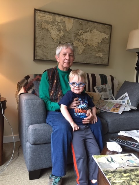 We found mom in her apartment. Tristan, while somewhat shy at first, was very interested in his great grandmother. Mom was delighted. Tristan, sure of the games he wanted us to play, had me running all around the apartment, hiding. As Tristan asked, “Where’d she go?” Mom would say, “You have to look for her.” Tristan would giggle and run to my hiding spot.