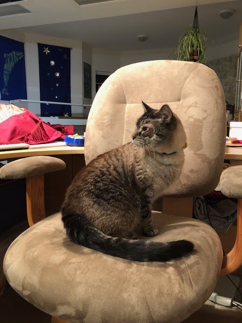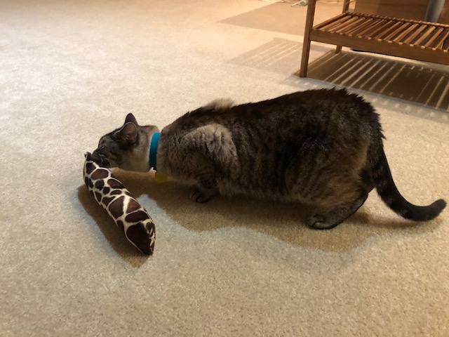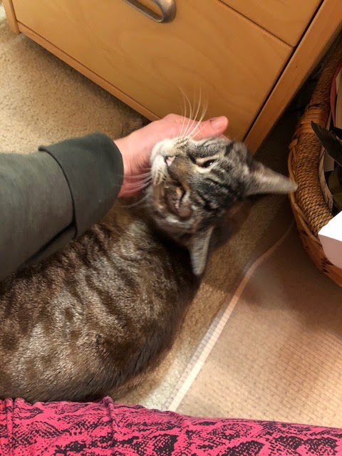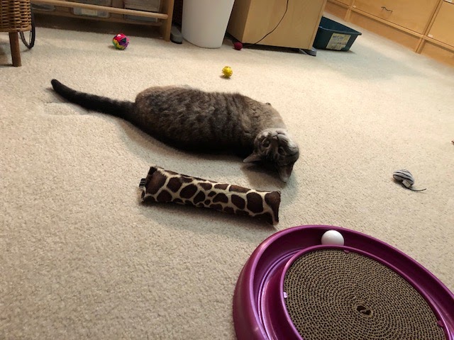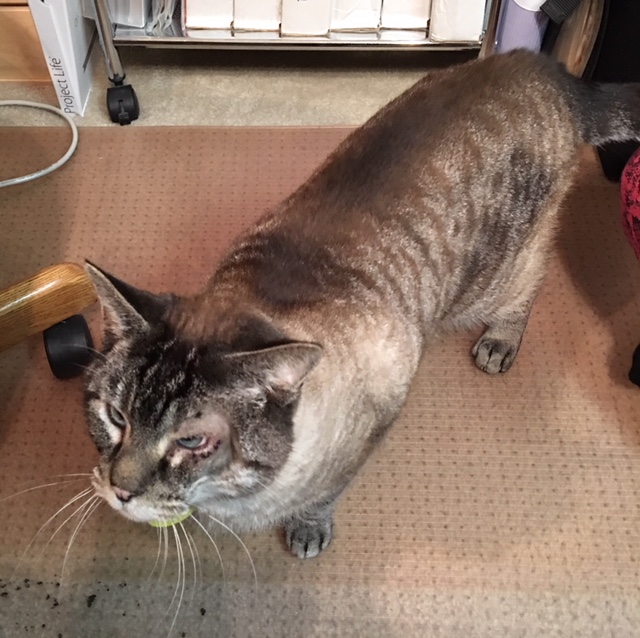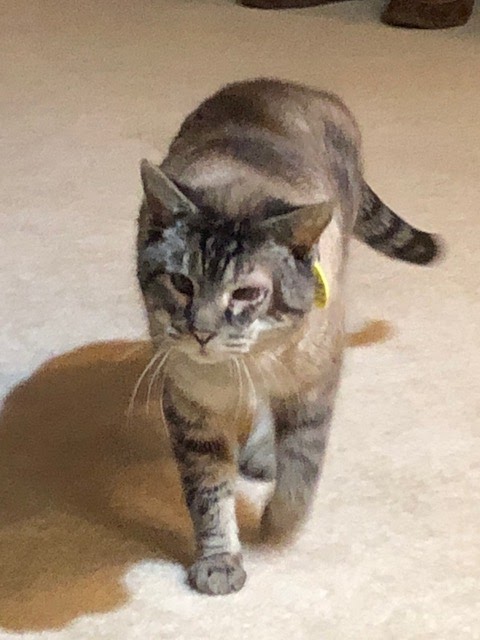Meet Elvis! He sports a brown/gray striped tabby coat, mixed with brown or seal point Siamese heritage. He has blue eyes, one of which is recovering from surgery to redirect the growth of his lashes away from the eye. He’s eating well, coming out of his shell, and has the entire down stairs of the house to hang out in. We hang out with him as much as possible, and have only taken one hiding spot away from him… The ball return drawer of the pool table. A week from Friday we’ll introduce him to mom.