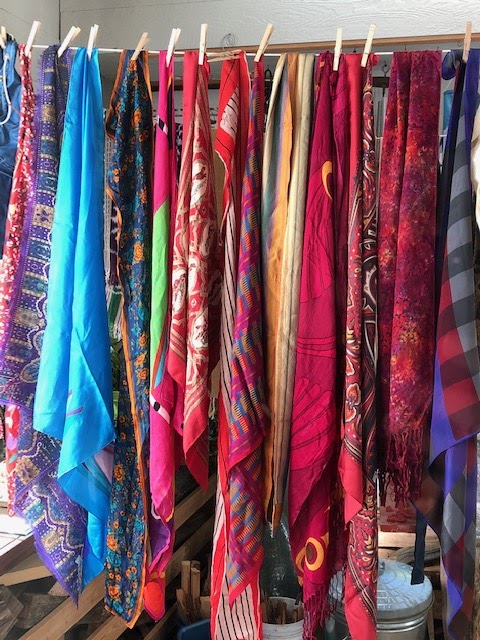 Today all but the most recently found kimono, and about 15-20 scarves are with mom in her apartment. I’ll probably pack the rest for the time being.