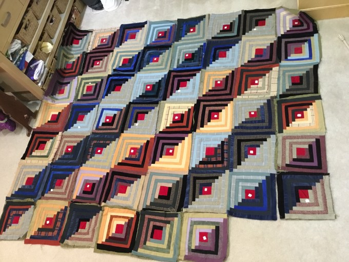 Working with this piece is like doing archaeology. It’s apparent that mom started this project, or got to the assembly stage, after dementia was part of her life. She was too good a seamstress and sewist in general to have made the mistakes she did. Also, when going through her wool stash (much of which was from clothing) for materials to make the two missing blocks, I came across a piece of clothing that she’d taken the arms off of for the quilt. She then tried to baste the arm-holes back together as though what once was a jacket could be made into a vest, despite the uneven cutting and not enough fabric left to actually make a hem. This basting was done in the same thread the quilt blocks were basted in.