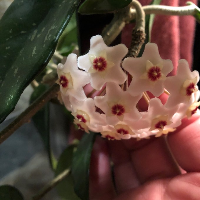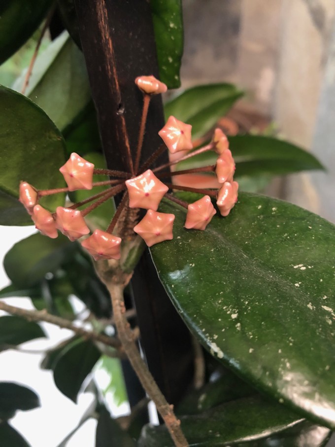 About two weeks ago I walked onto our bedroom, smelled the familiar sweetness of the Hoya, and smiled. I’m SO happy the Hoya, after being transported in a moving van in the winter, graced us with three sets of blooms.