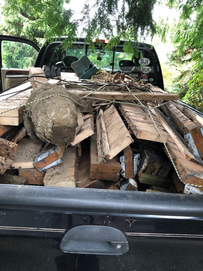 This morning and early afternoon was spent corralling the last of the dead deck. It was 1000 pounds, which means I picked up 3000 pounds: Once to move it into the Gorilla Cart, then haul the cart as close as I could to the truck, then pick it up again, and place it in the truck bed, and then pick it up one more time, and toss it over the wall onto the floor of the transfer station. All of this on a breakfast of a banana and almond butter. Thai lunch with iced tea never tasted so good, as did simply sitting for an hour.