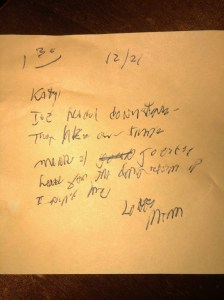 I can make out the first line, and a couple of addition words, besides the “Love Mom,” which I am so thankful she is still able to pen somewhat legibly. It’s interesting that she retains the ability to write numbers, and knew the date!