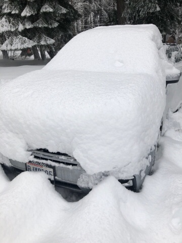 I woke up to a foot of snow on the car, drifts up to my knees, and the east-bound pass-crossing closed. I felt panicky while packing up. The car has “X-mode” for its all-wheel-drive system. I used it to get to the highway, where the road was plowed down to packed ice and snow.