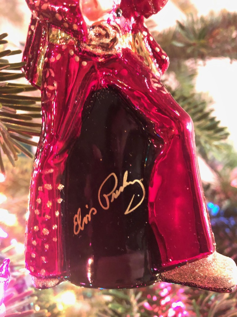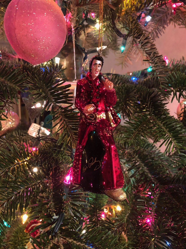 I was able to gather the remainder of the unexplored boxes when we returned from our walk. There were more ornaments, most of which I’d never seen, the aforementioned Wise Men, and Elvis. Elvis was in his original packing, including price tag! The package was covered in dust, but Elvis was spotless. I carefully removed him from his package, and put him on the tree. This lightened my mood, and gave me permission, somehow, to move along any of the other ornaments that don’t speak to me. Elvis will always have a place of honor on the tree.