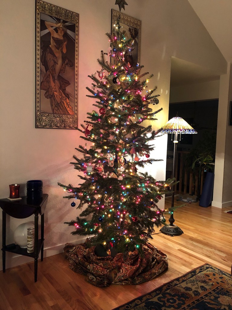 We stayed up impossibly late last night working on the tree, and the cause has been advanced today. I’m fairly sure we’re at the glass icicle stage. This is a fraiser fir with finer branches than a noble. It won’t hold the heavier ornaments, nor as many as we usually use.