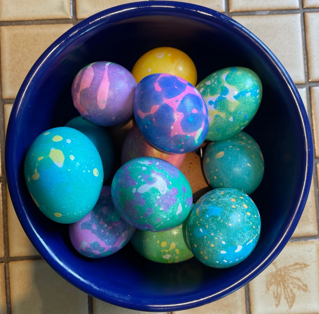 My mom had a unique way of making Easter eggs. We used the usual Paas dyes, but she put a little vegetable oil in each color and whisked it before the egg went in. This created white spots where the oil got to the egg before the dye. Then the egg was removed from the dye, the oil gently wiped off, and then the egg placed in another color. We usually started by dying the eggs with the lighter colors, and over dying with darker colors. The only change in the process is that the dyes are more intense now. Try this out. You will be an instant artist! Here’s this years batch: