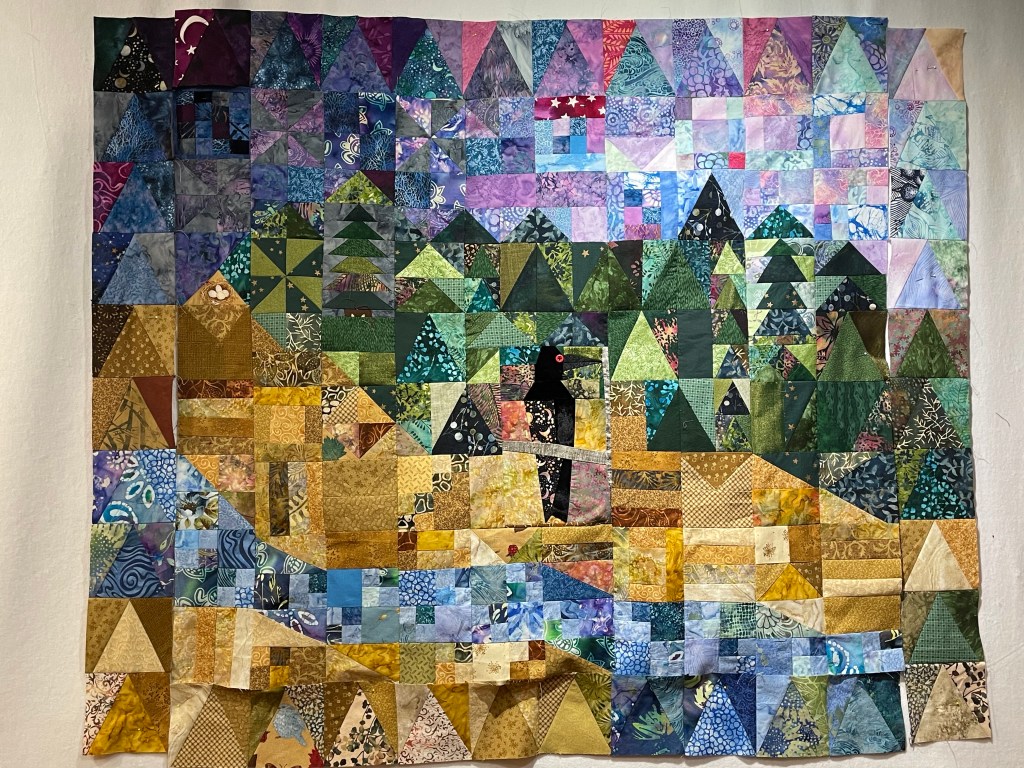 The borders are done, in 4 strips, but not attached to the quilt yet. As I created the border blocks, the raven kinda got lost. I’m designing him some friends!