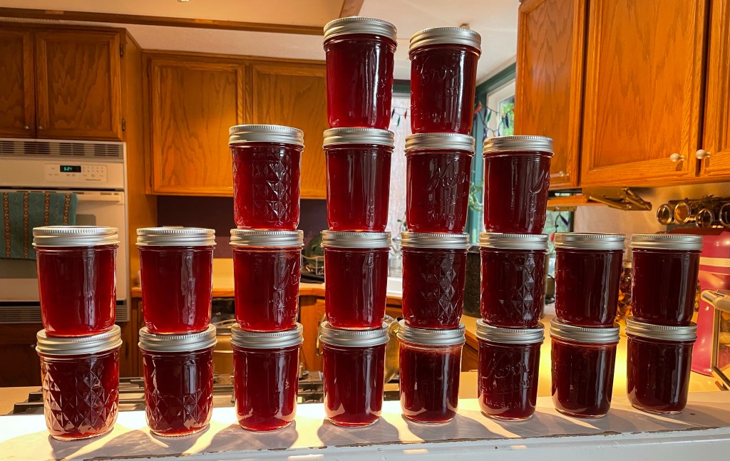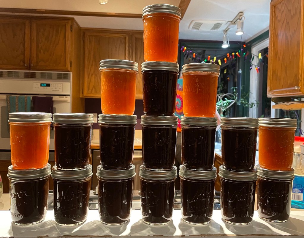 We also have 4-half gallon Mason jars sitting in the downstairs pantry brewing a vodka based plum cordial. This year’s innovation is whole cloves in addition to cinnamon, lemon, ginger, and just enough sugar to call it a cordial. We’ll see how it turns out in December when we bottle it up for gifts!