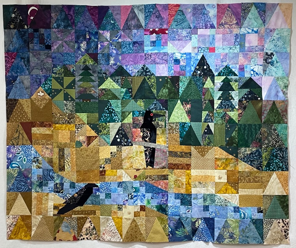 After tearing this quilt apart three times, adding the second raven, deciding I didn’t have the paper piecing skills to add the third raven as I’d drawn it (I’ll quilt it in), this is the top with its boarders, ready to quilt.