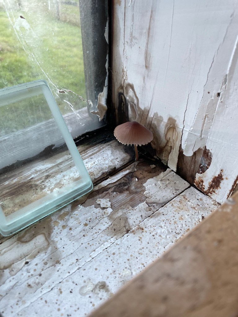 We chose the color for the lower barn’s new roof today, a medium grey, and gave a the roofer a material deposit. This will be a very expensive endeavor, but far cheaper than allowing water infiltration continue to rot the building’s sheetrock, rafters and window framing, where a sweet solo mushroom is growing. The roofer will also remediate the wood stove’s chimney and chimney/roof interface. What a delight it will be to be able to heat the space.
