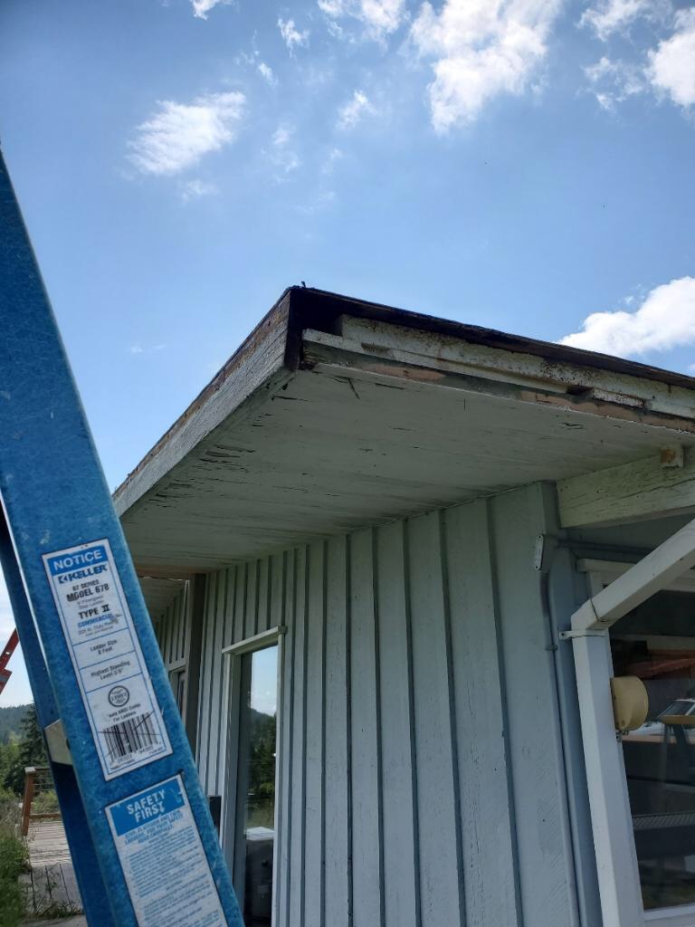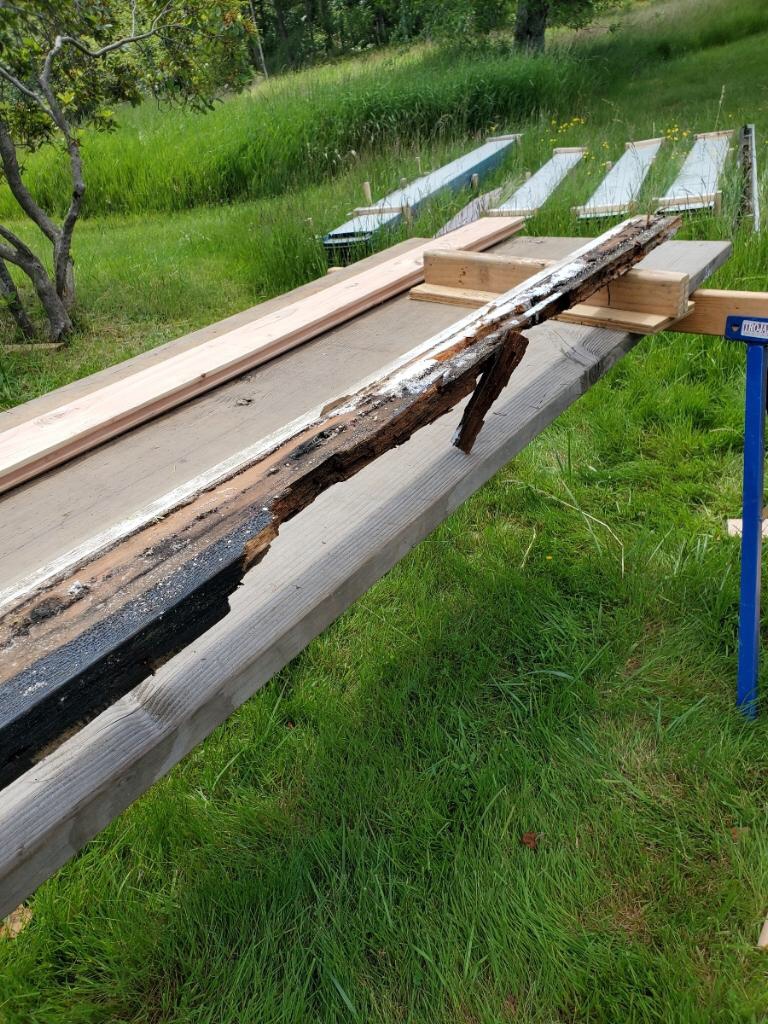 Here are pictures of the facia and exterior car decking rot that the roofer has excised from the house. He explained that the builder of the house (who owned great swaths of the subdivision, and whose buildings are now number of different homes, including this one), tarred the top of the car deck ceiling. This caused the great majority of leaks to travel to the perimeter of the house where the roofer has completed surgical repair. He said, “The chimney/skylight has been leaking for a l-o-n-g time.”