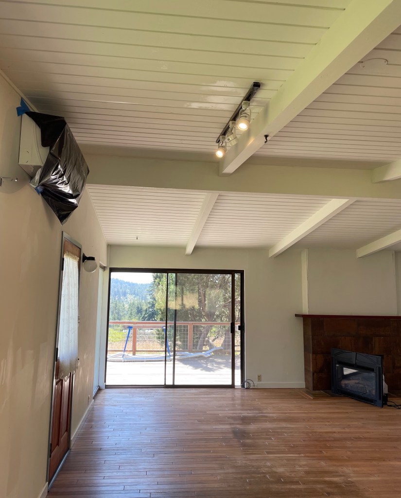 Weed whacking only lasted through two line refills before it was too warm to keep going (10am). Then it was back to the house for additional cleaning, the finicky painting, interior painting and reinstallation of a track lighting fixture. The electrical box has its cover back on it, and the fridge is back in front of the box on a clean floor. Top of the fridge is clean too… The 6′ sliding glass door got the same treatment today as the 8-footer did yesterday. I am hoping a leak-free roof will keep the gunge from reasserting itself. I spent time slaying chaos in the lower barn, and then focused on eradicating a salmon berry that is holding old gate pieces, a palette, and rotten wood hostage. It doesn’t really make great salmon berries, so not a lot of guilt… Perhaps when all the crap is dragged out of this spot, the berry will grow back and make something of itself! 😂