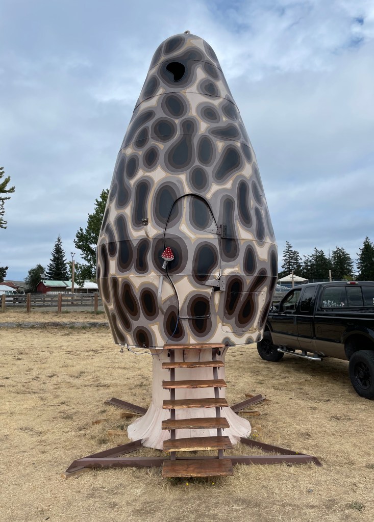 I headed to town in time to get shopping done for the next few days before meeting my DH at the ferry. On our way home we stoped at the fair grounds to see a friend’s art installation, and then visited with Tim. Once home, we took a walk across the upper five acres, pondering where an additional small trailer might make a sweet office for my DH. The walk concluded with a lovely visit with our neighbor to the east. No immediate plans for the office project… Just an aspiration.