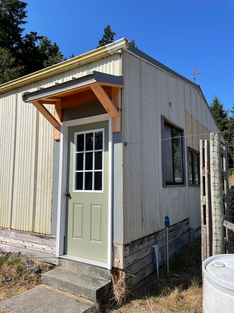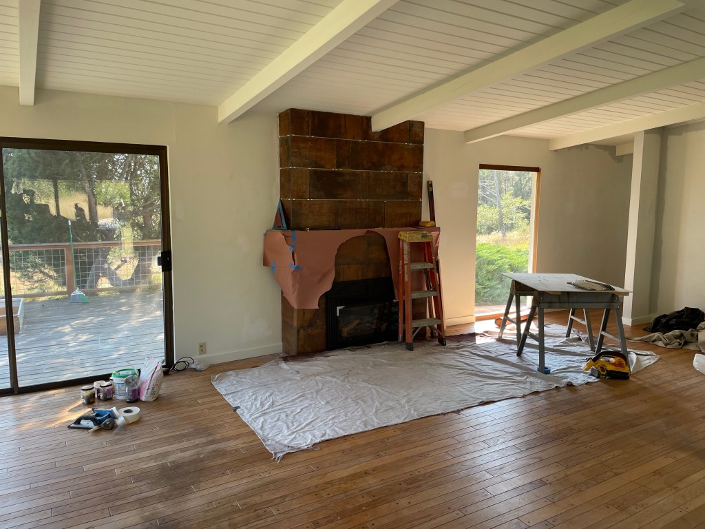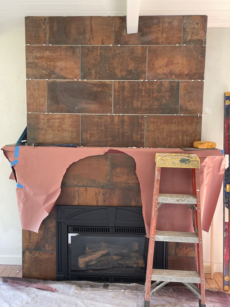 The place was a hotbed of activity today. My DH mowed (for hours) and took Lots of debris to the burn pile. I continued with interior paint, and then joined my DH with outside activities. The roofer and his foreman got the porch roof over the pump room door completed. They left me their big wheeled magnet. I pushed it around the overhang off the lower barn and picked up rather a lot of screws and staples. The tile guy set the tile above the mantle today. It looks stunning. It’ll be even more beautiful after he grouts it tomorrow!