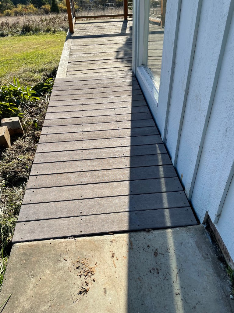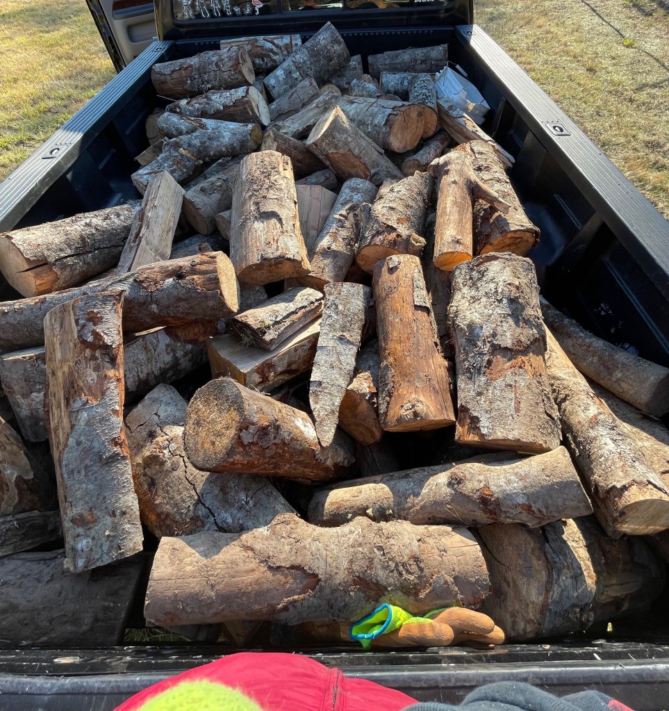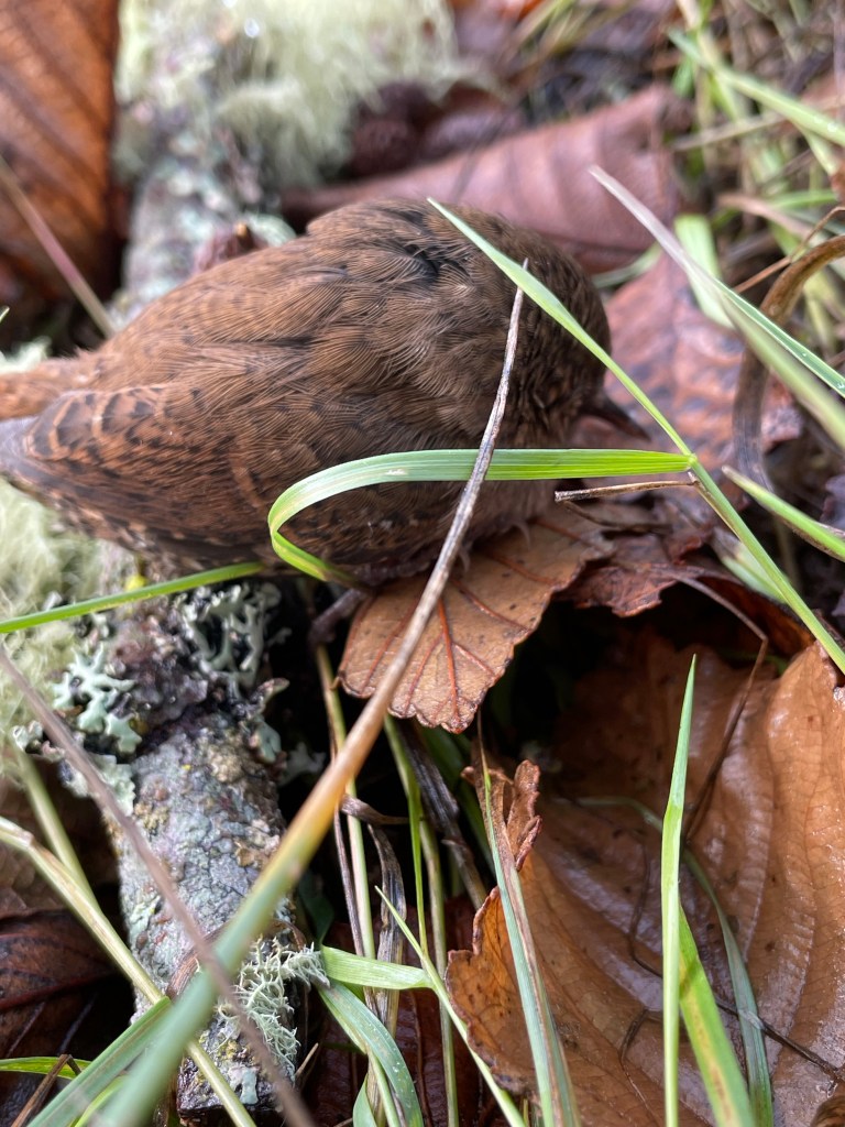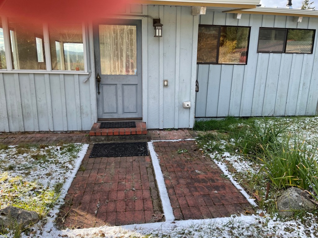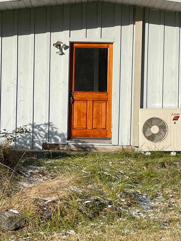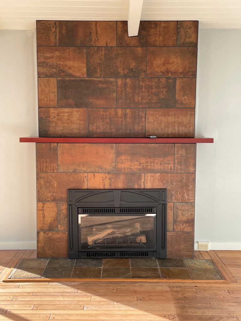 Tuesday snow!Refinished front door!Wee little bird I rescue out of the lower barn. It had left when I checked on it later.The magic of fake tile!A not rotten walk to the deck.The fireplace trim practically vanishes into the wall. A truck full of warmth.