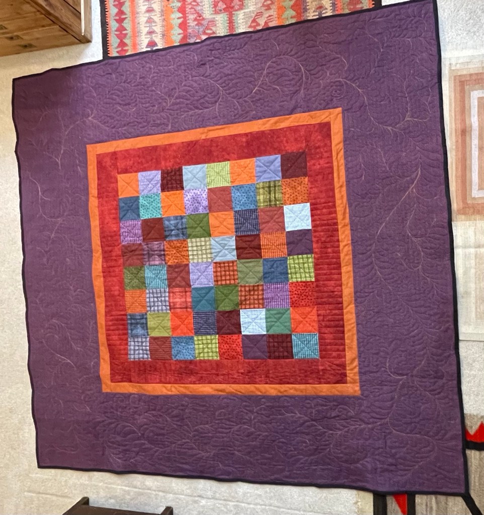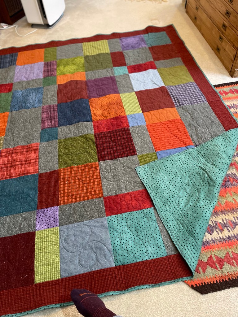This top started as a pieced backing for the above. It didn’t take long to realize I had a second quilt top! The back is pieced in order to use the fabric I had on hand. The dark grey, traditional, binding was purchased and is part of the line of fabric the rest of the quilt (and the one above) is made from.