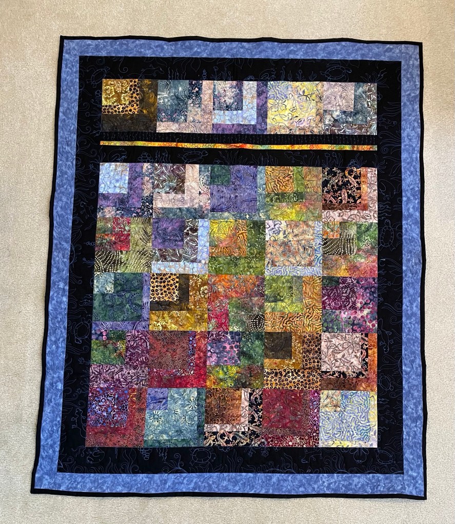 This is a small ‘throw.’ The long side isn’t quite 6’. It was a kit I bought a long time ago, and put together, quickly, about five years ago. The stripe through the upper part is my adaptation. I sew like I cook: “Oooo, this modification will be fun/improve/change up the outcome.” If the photo makes the leap to the blog with enough clarity, check out the quilting (by Artichoke Quilting in Everett, WA). Lot’s of aquatic animals!
