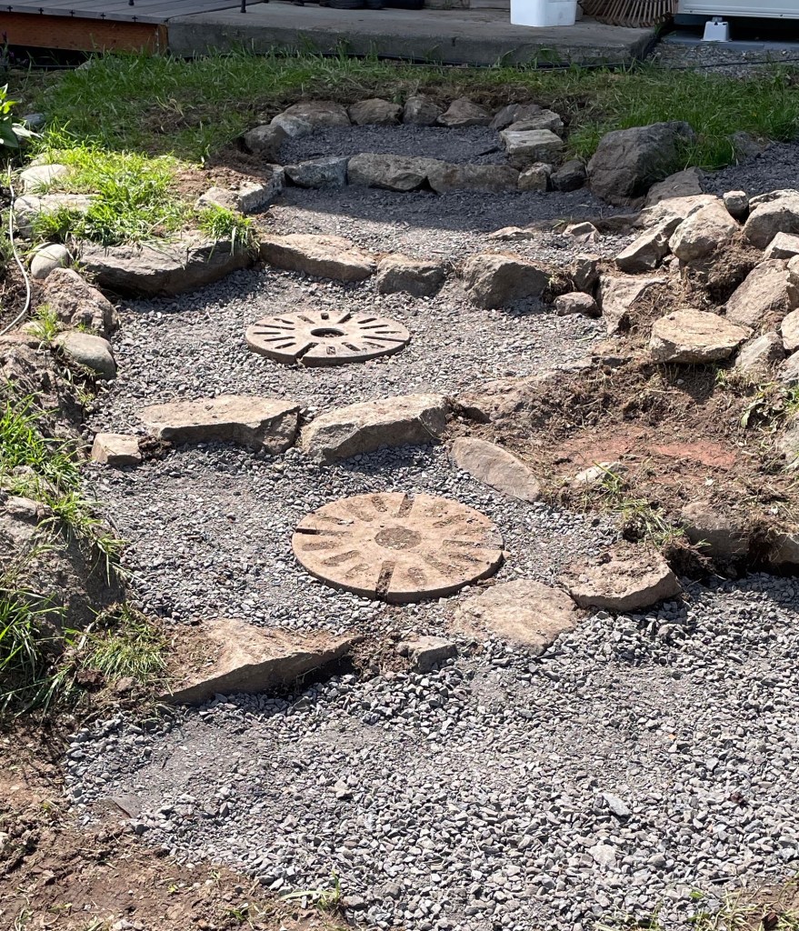 Our tenants finished refurbing, minus more gravel, the steps between the two perennial garden beds today. These are steps that were created after I left, post high school, and were overgrown by the time I needed to come back. I knew they were there, but couldn’t see their structure. They’re not fancy, and they’re lovely in a perfectly country way. We think the iron pieces are tractor parts. They were buried under turf.