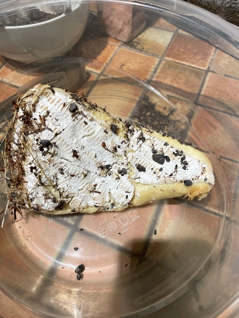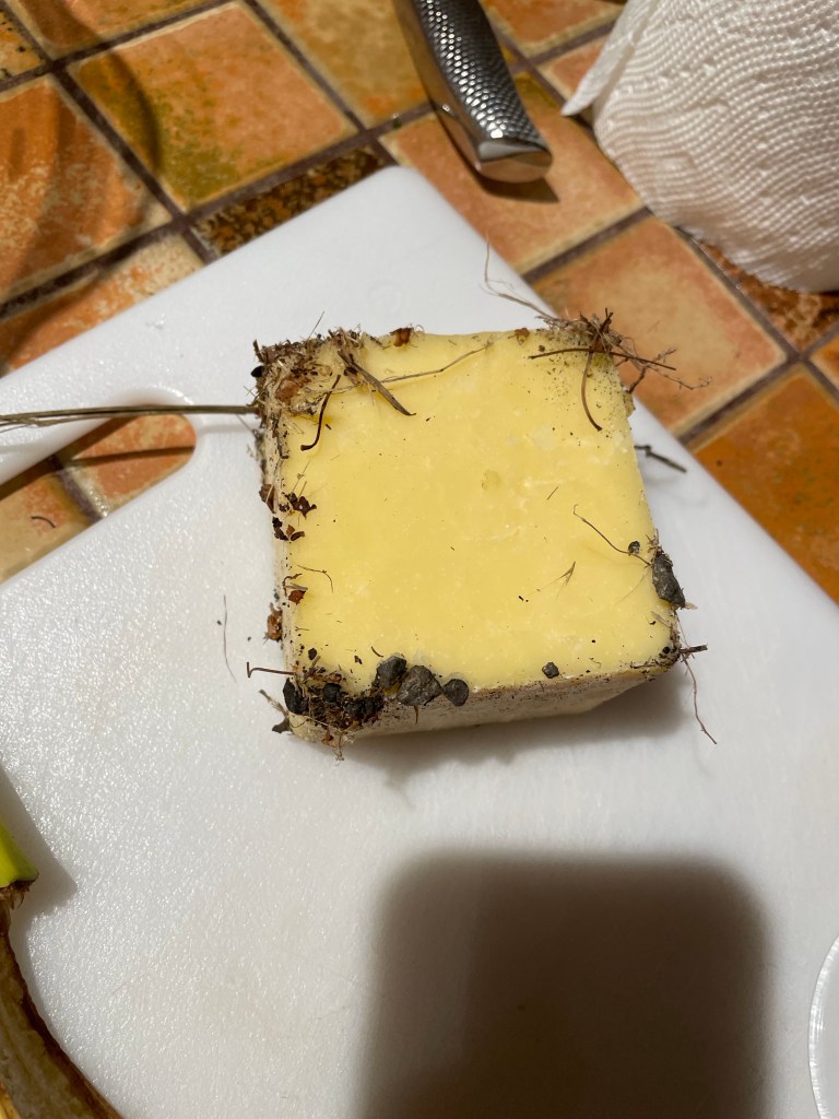 After cleaning up I did very little for an hour and a half except bake purple potatoes. At 5:30 I went down to the house with three pounds of black cod, the potatoes and Irish butter. Tim and my neighbor to the east joined us and we had a delicious dinner on the deck completed by banana splits!. Tim was suppose to bring cheese, but arrived with a sad story of dropping the plate on the ground on the way to his car. We reassured him, and asked him not to feel bad. These things happen. So, we fired up the grill and rolled right into dinner. As the gathering wound down, Tim asked, “Do you want the cheese for your ravens?” He explained he doesn’t have ravens at his place, only two miles away. We said, “Sure!” It was indeed sad looking cheese, but any bird who can dissect a rodent with surgical precision will know how to work around a few stones and fir needles.🐦⬛