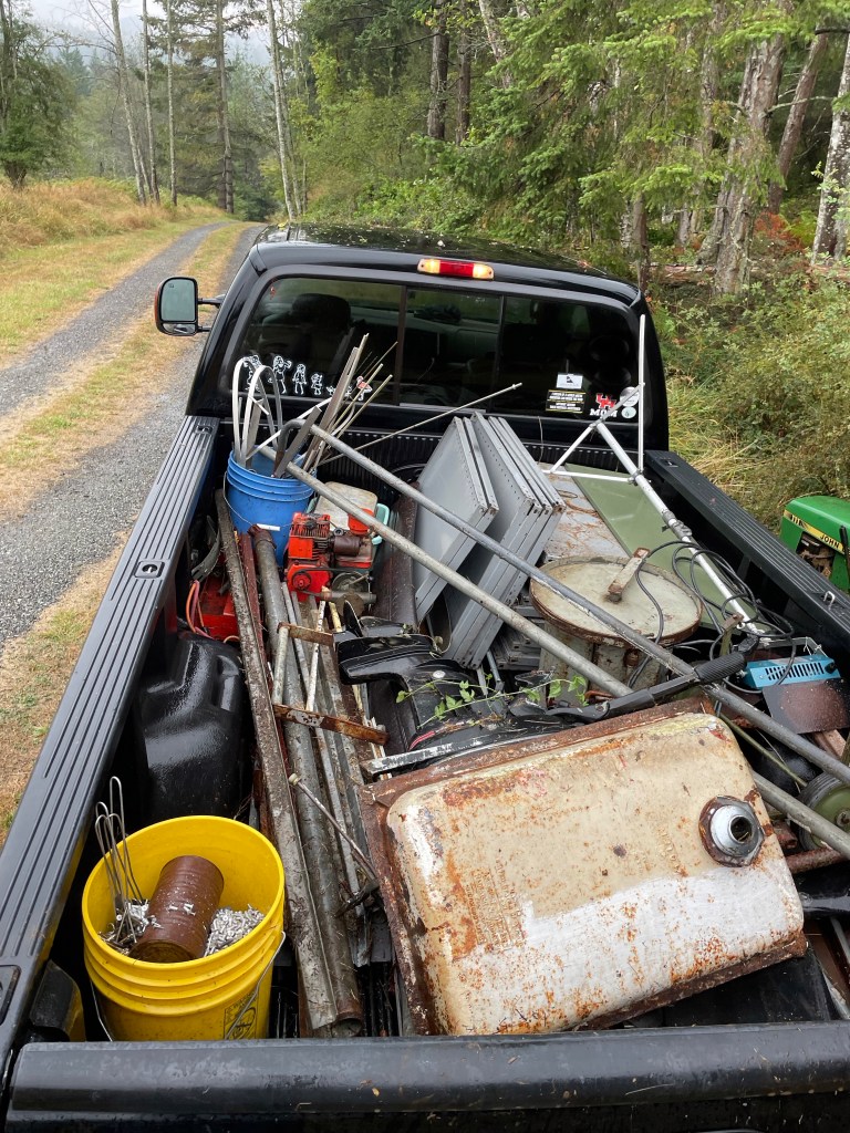 My DH got our trail cam working again this morning. We’re looking forward to more wildlife shots. He also confirmed that a key that reluctantly fits into Stella’s hitch lock, isn’t the right key for the lock… We then moved a Very Heavy butcher block table from the upper to lower barn using a mechanic’s creeper and an appliance dolly. Next was to rejoined the large work table frame to its top without damaging either of us, also now in the lower barn. Then load the truck with all the metal scrap that would fit. I have a request into our AN to further load the truck with bigger pieces of metal from the scrap heap, if he has time.