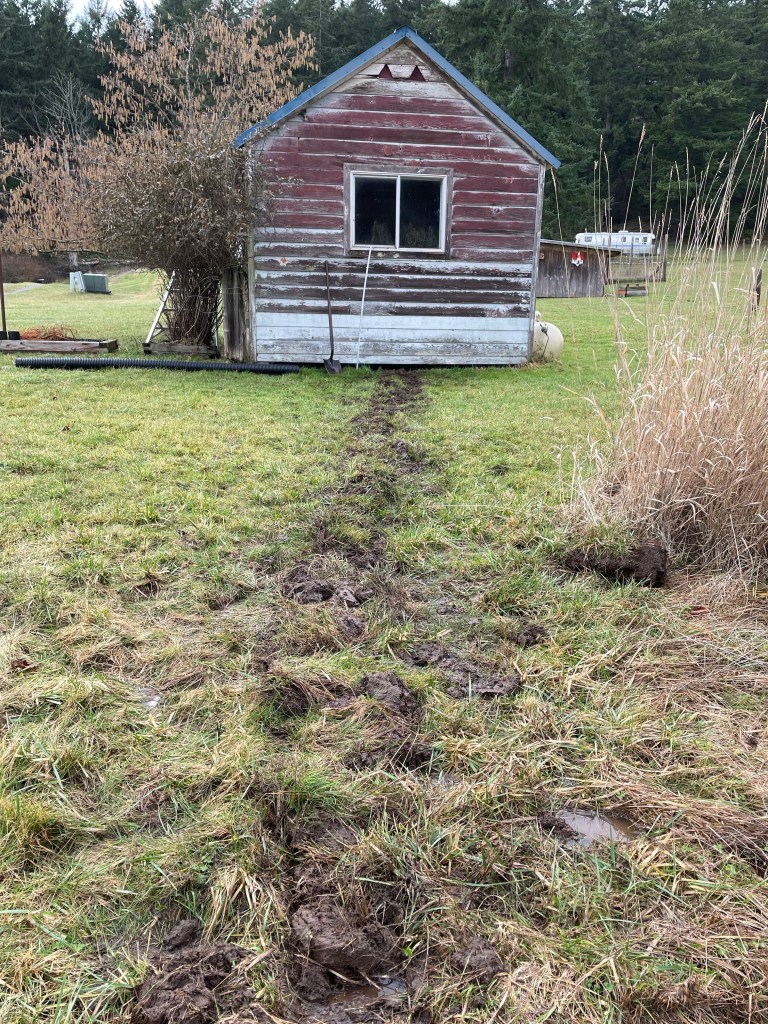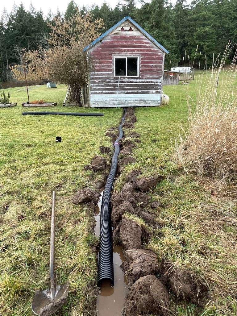 - Installed the drain pipe purchased at the lumber yard. I’m going to keep digging the trench tomorrow, however… So it meets up with the creek outflow. I’m very happy how much water has drained from under the dryer shed.