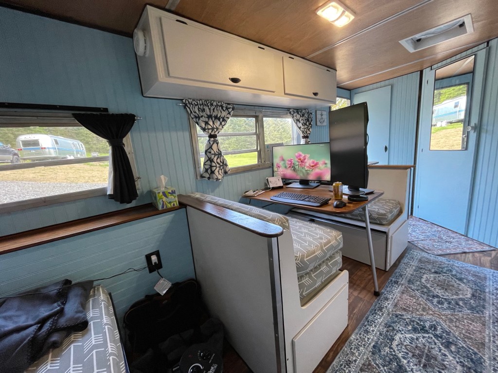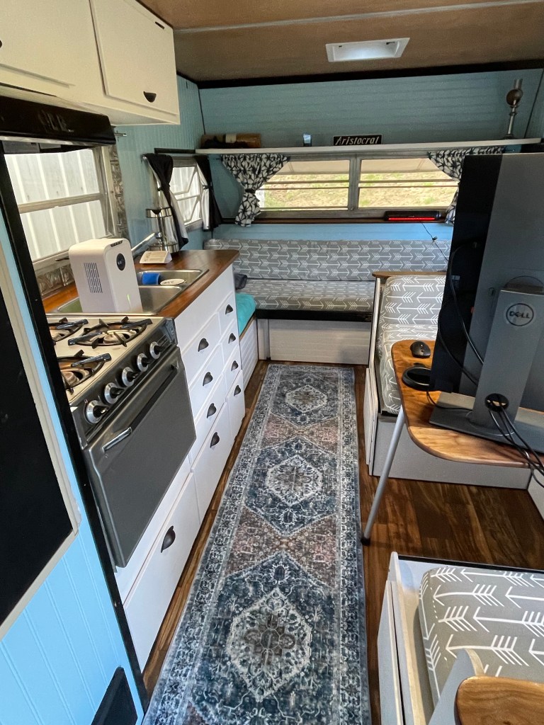 My DH got LJG cleaned, situated, comfortable, and ready for a week of work! There were some discoveries… A couple of window cranks that need rehab, and we’d like to add a shelf to each of her upper cabinets. Her wooden counters glow, and the washable rugs my DH chose for her look fantastic!