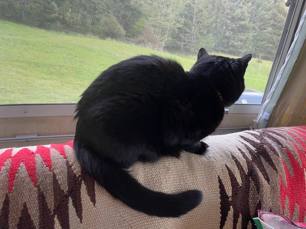 The cat was social this morning. We found him buried under our covers when we returned from errands. He remained there for hours. At least this is normal behavior for him. He declined a walk, and came out for dinner at 6, with encouragement. We decided to remove his harness. He had a good wash and seems far more relaxed. We’ll try a lighter weight harness tomorrow. This evening, with encouragement, he went out, but only long enough to figure out the direction of the underneath of the Airstream. We let him back in immediately. He’s currently sacked out on the couch next to my DH. 😻