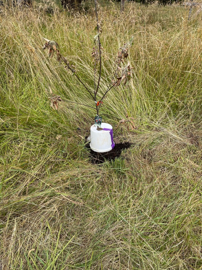 It was another hot day, and then cloud cover added mugginess to the atmosphere. After getting a final load of laundry going (it is a gift to get home and NOT have to do 3 loads of laundry!) I took the push lower and worked on excavating the little trees in the garden. I was distressed to find one of the apples browned out with soil missing from around its base. Last week it looked great. After adjusting its dripper, which was sending water three feet away from the tree, I weeded around it only to discover voles have been nibbling on the apple’s trunk. Same with the other apple, which looks happy. I sacrificed two small buckets to make vole deflectors, and have forgiven myself for things like letting the grass get five feet tall around the trees, not keeping in mind that voles like to snack on young tree bark, and that gardening when only in residence 25% of the time is fraught.
