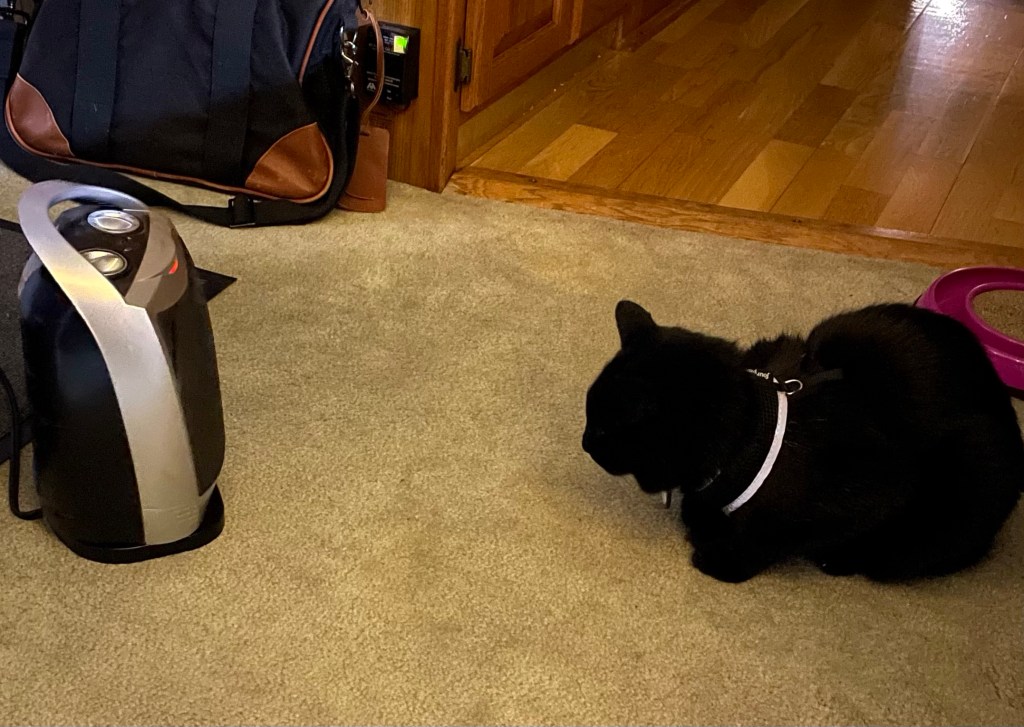 Our neighbor to the east stopped by to bring us a couple of puzzles. We had a pleasant visit and made plans for dinner tomorrow. Her doggo came along, and while he didn’t come into the trailer, the cat was completely offended 🐈⬛. I sent him into the bedroom and closed the door. When the human’s relocated outside, the cat sat at the screen door with dagger eyes! He has since recovered his good humor.
