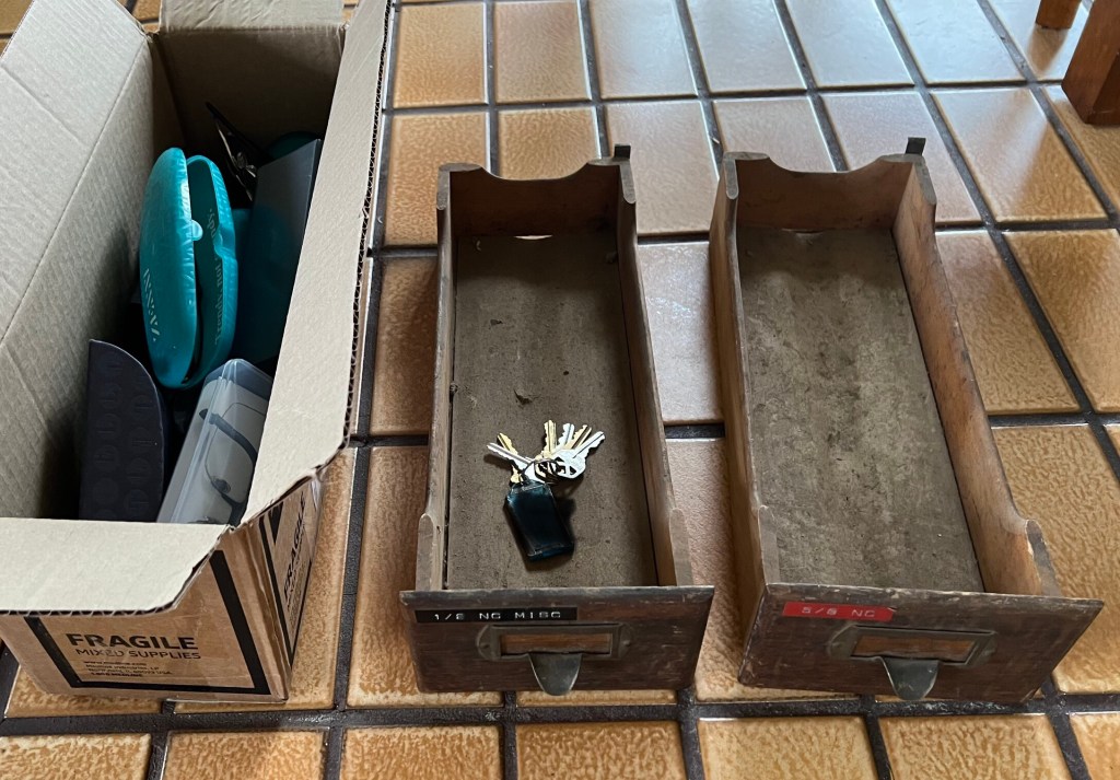Late last week a small batch of items showed up overnight on the tenant’s front porch. It could only have been from our AN and his wife. Included were two oak card catalog drawers, and keys with my name on them. I looked closely at the picture the tenants sent and for sure the drawers were my father’s. The dymo labels in the upper left corners and the drawer linings were the giveaway. The additional items, in a box, are a bit of a mystery, but we’ll be there in a week and figure it out.
