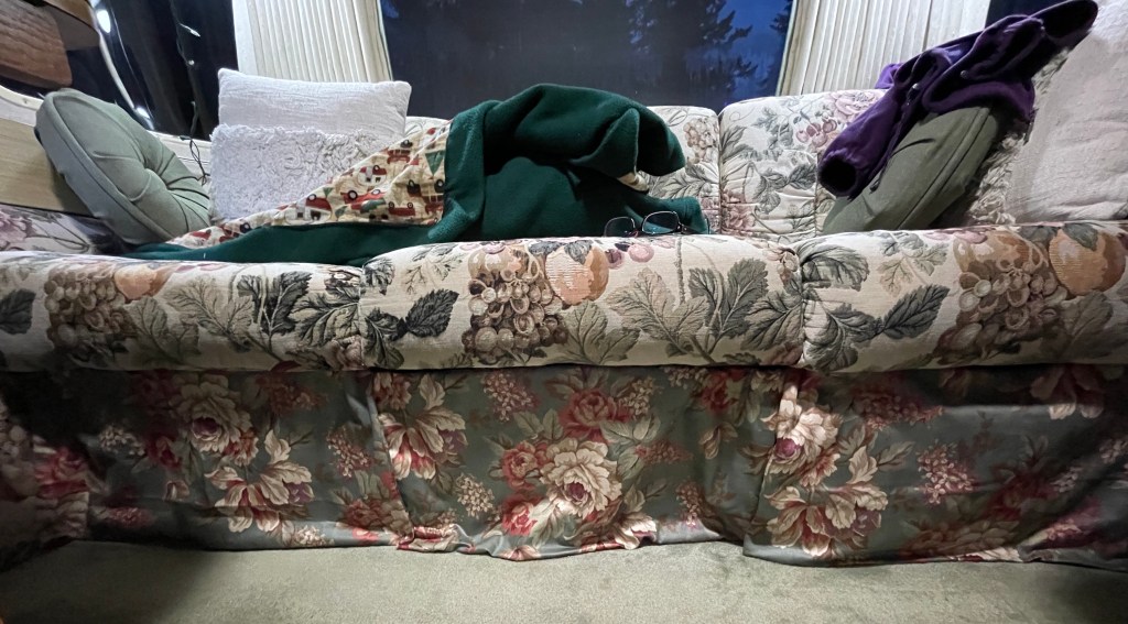 The one thing I did get done was to make a ‘skirt’ for the couch. It has earth magnets holding it up its three sections to the couch frame, is made of a fabric that doesn’t fight with the couch upholstery (which is kinda a miracle), and was easy to throw together. The purpose is to banish the cold air that streams in from under the couch now that the malfunctioning drawer that used to be under the couch is gone. It’s a shabby chic look not meant to be ‘tailored.’