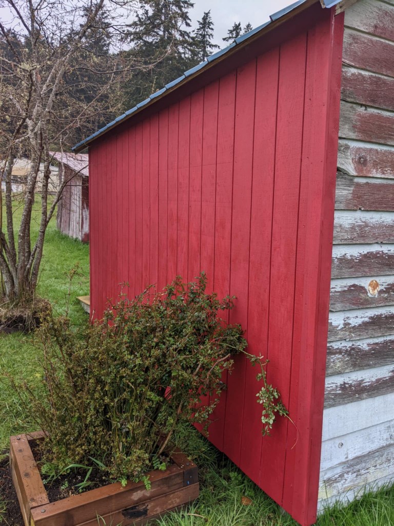 The south wall has it’s new siding installed! The rose looks a little forlorn that it’s been excluded, but we have a piece of wrought iron fence to attach to the building for the rose to grow on. I’m a fan!