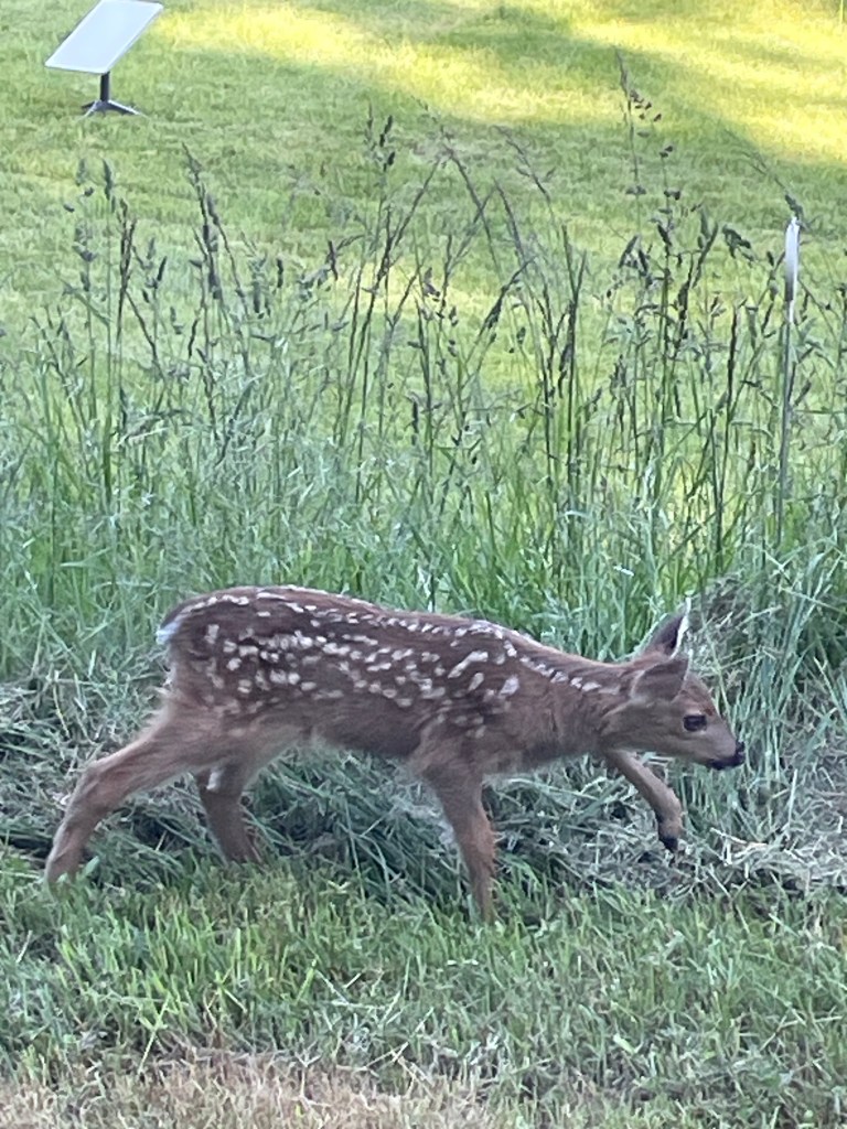 There are Two sets of twin fawns and their mom’s around the property. I saw one set yesterday, and another today. What was so astonishing about today’s sighting is how teeny the fawns are. Maybe 15” at the shoulder! Yesterday’s were bigger and their mother much thinner.
