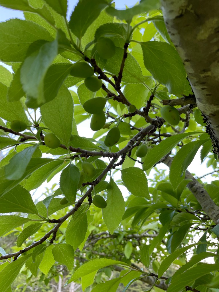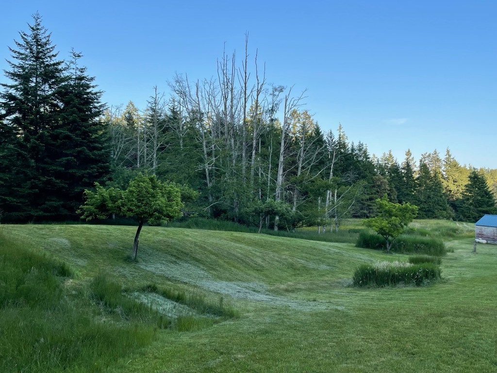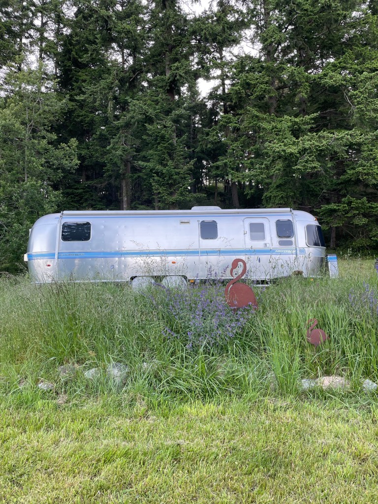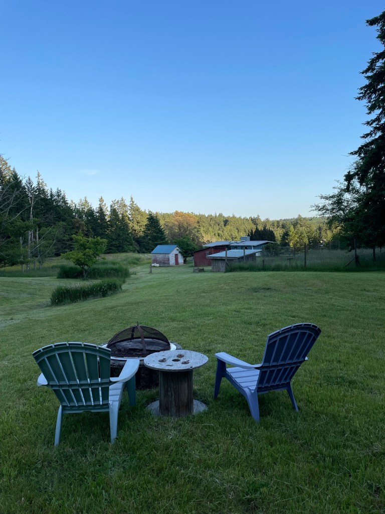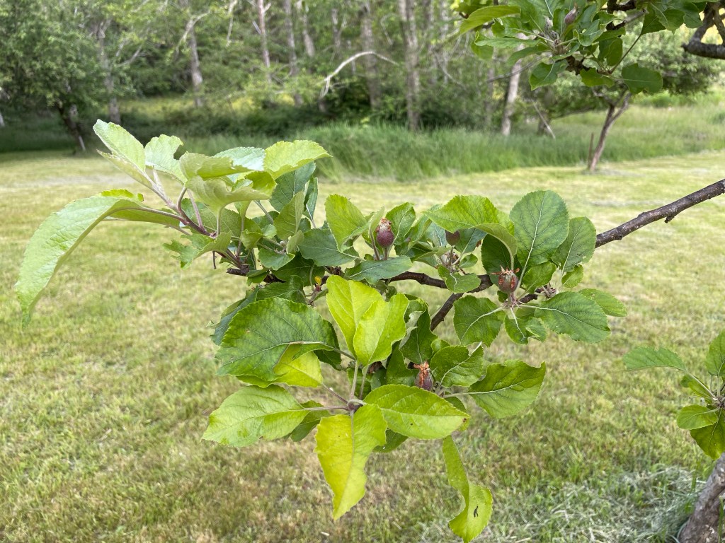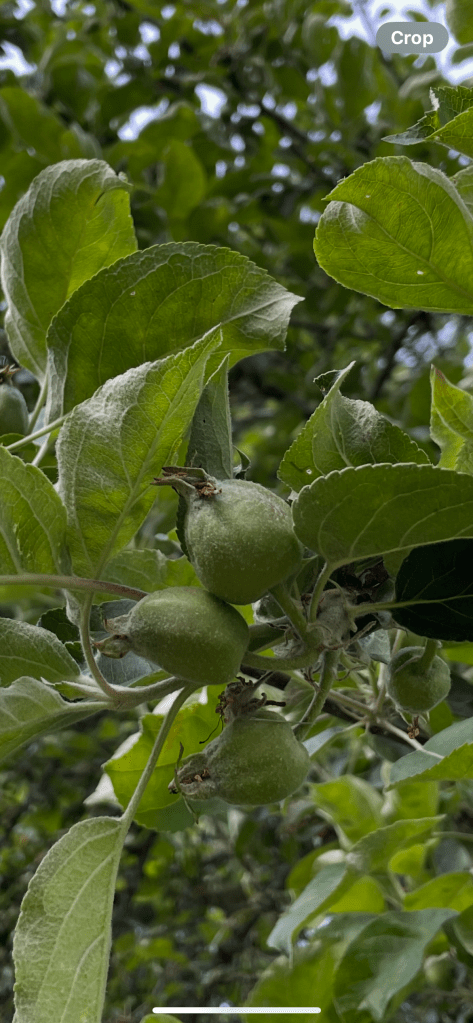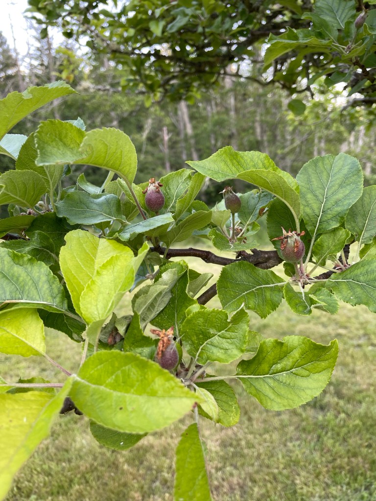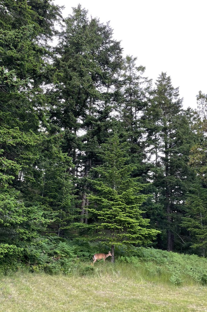 The deer population has recovered. We seem to have 8 regulars, including two does with twins, and two does who hang out together. This gal was spotted at the edge of our woods.This is a 5-gallon solar shower attached to the limb of a fir above Stella. We’ve just bought a hose long enough to fill the shower from Stella, and will create a simple pad below it, as well as provision it with biodegradable soap. Sometimes ya just want to get clean outside of the trailer, and not add to the grey water tank, whose management is our short coming 😂.All buildings/trailers on the property in one shot!View to the east looking at the apples trees, the plumb, and the crumbling alder stand in the background.We need new campfire chairs… One of them cracked down the middle… We have my MIL’s canvas camp chairs that will work really well, and be WAY easier to get out of!!! 😏Wish I’d taken a post weeding pic! The purple is cat mint, and hidden to the left is lavender, ceanothus, lambs ear, and rosemary!The promise of plums!!!!!!! I’ll install the electric fence around the tree next month. Raccoons can’t jump.The apple trees are busy. I am besotted after two years of meager harvests due to tent caterpillars. I sprayed Bt, and will do so again early next month, to dissolve their guts!