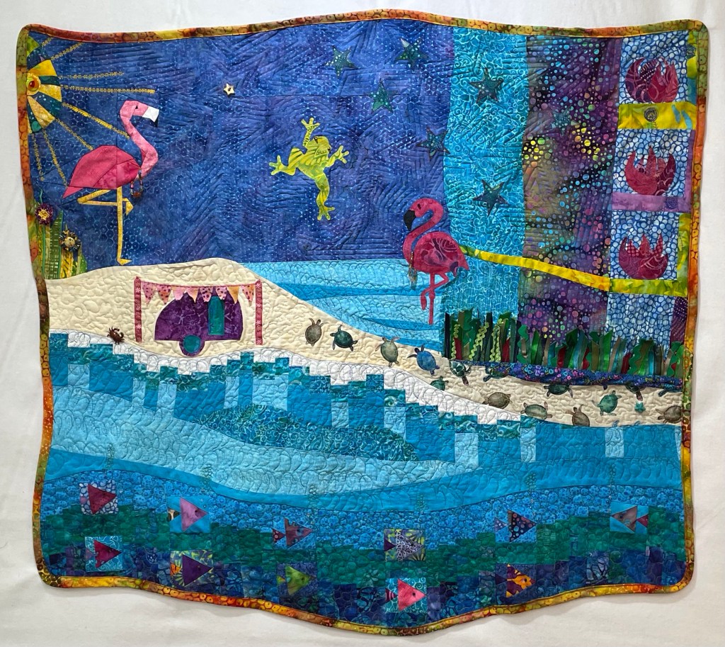 Here’s a pic of my class quilt. It’s silly, ridiculous even, fun, whimsical, and just what I wanted it to be! There’s beading, starfish, pennants, necklaces, a crab, ribbon grasses, and more. This piece will likely live in Stella. It’s about 38” by 34”. It was a joy to make, and collaborate on with my quilting pals 💜🦩.