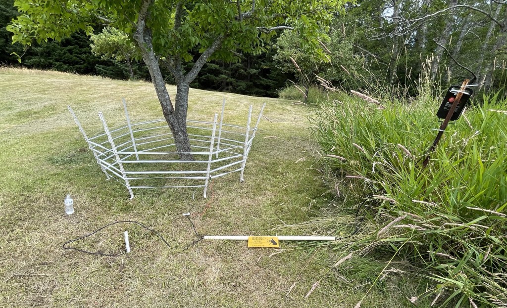 Next up was to put the electric fencing back up around the plum tree. I confess to being intimidated by this. Two years ago my AN coached me through it. The install was elegant. Today I consulted my book on the subject, looked at photos for the 8th time and dove in. It’s not as pretty, but it’s charged, and will deter the raccoons.