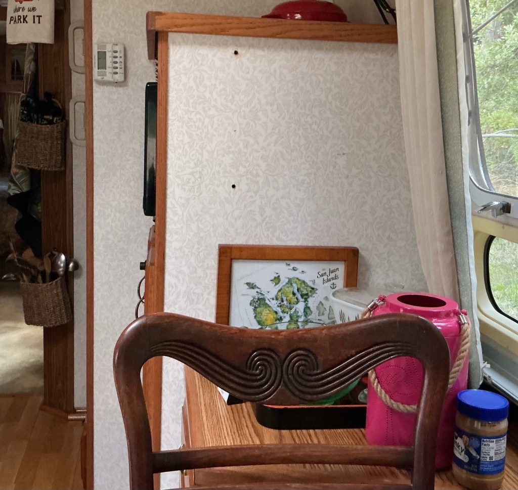 The TV was oversized for the cabinet it was mounted to, and stuck out enough that we had to, not exactly maneuver around it, but make sure not to bump into it. It also got in the way of opening/closing a curtain, which was a pain. I’ll remove the wall paper behind it, patch the holes where the mounting bolts were and see what art, or shallow shelf might go on the side of the (microwave) cabinet.