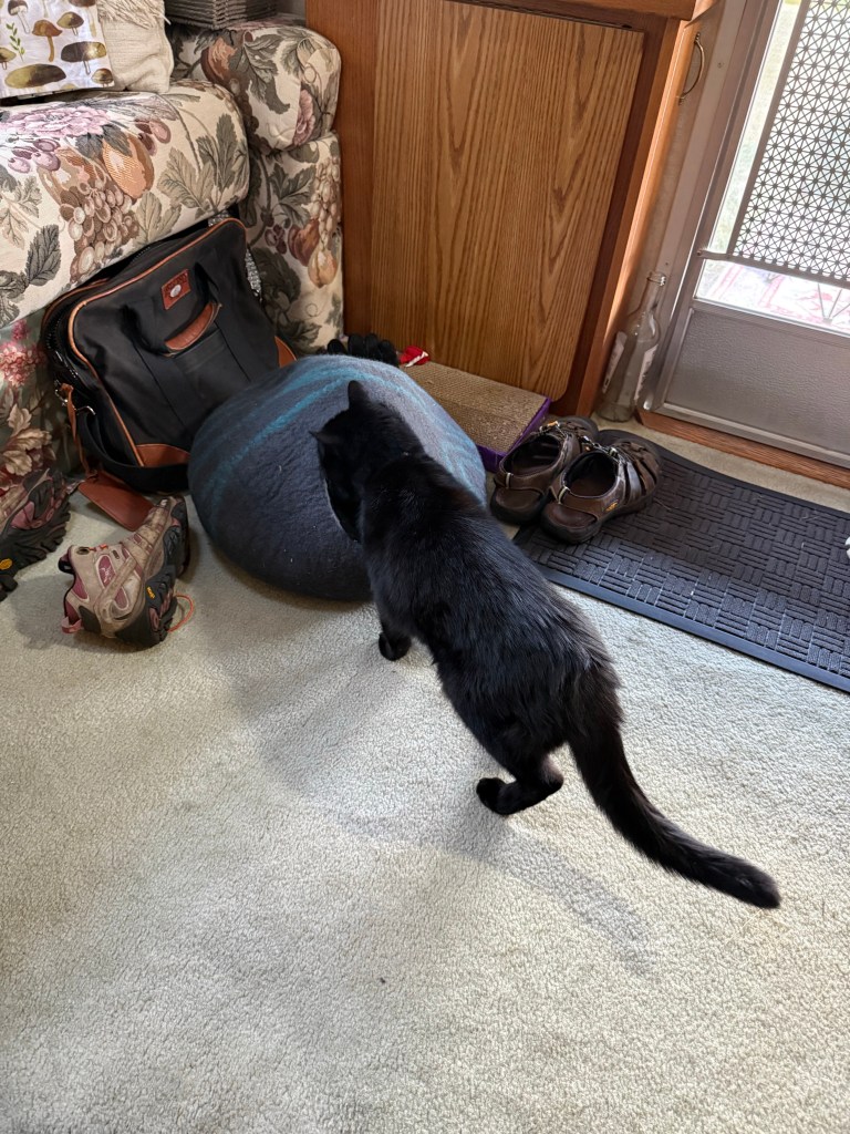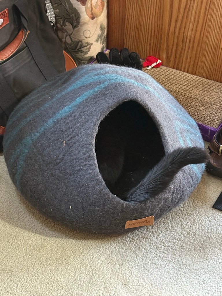 - Late this afternoon the tenants asked if our cat wanted a felted cat cave. Their cat doesn’t do enclosed spaces. My DH and I talked about the offer for a minute and thought, “Sure!” Pictures below.
