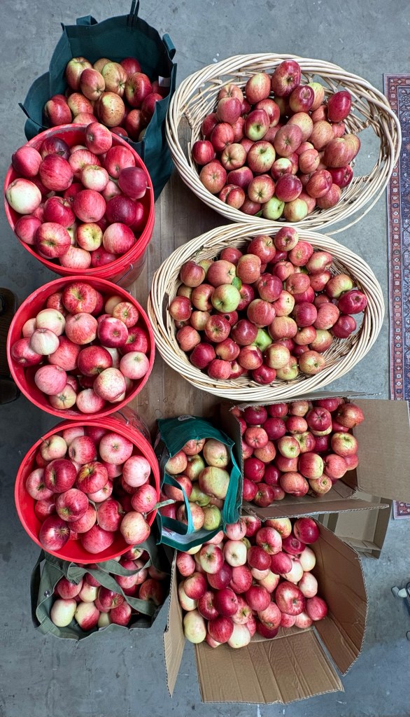 - I also picked apples. Lots of apples. Possibly more than the first harvest, which was more than 150#. This time they are bigger! Seldom do I think about apple picking as a workout, but hours of reaching and going up and down the ladder makes me think otherwise now!