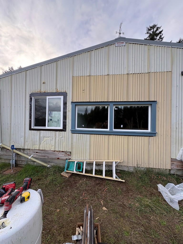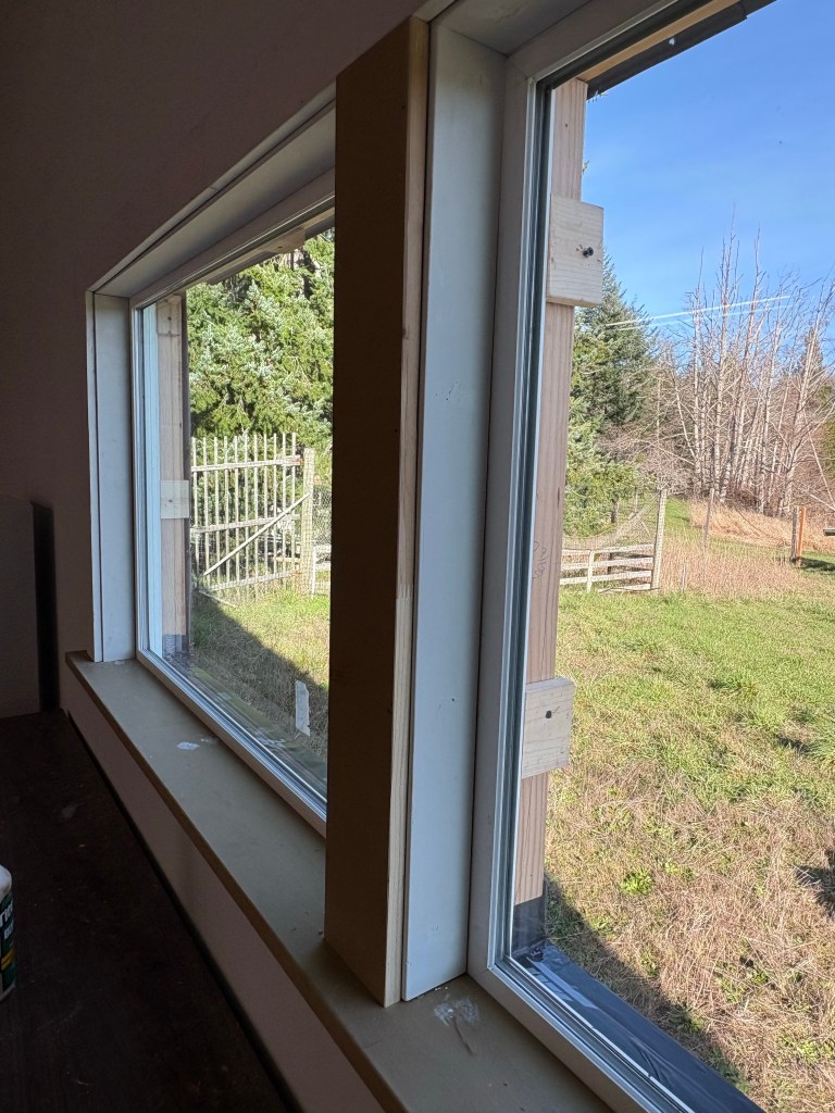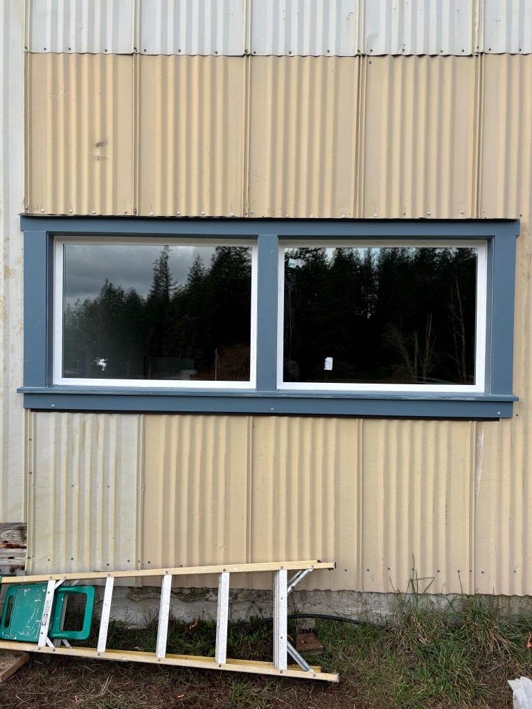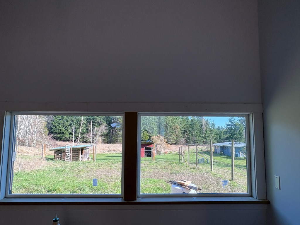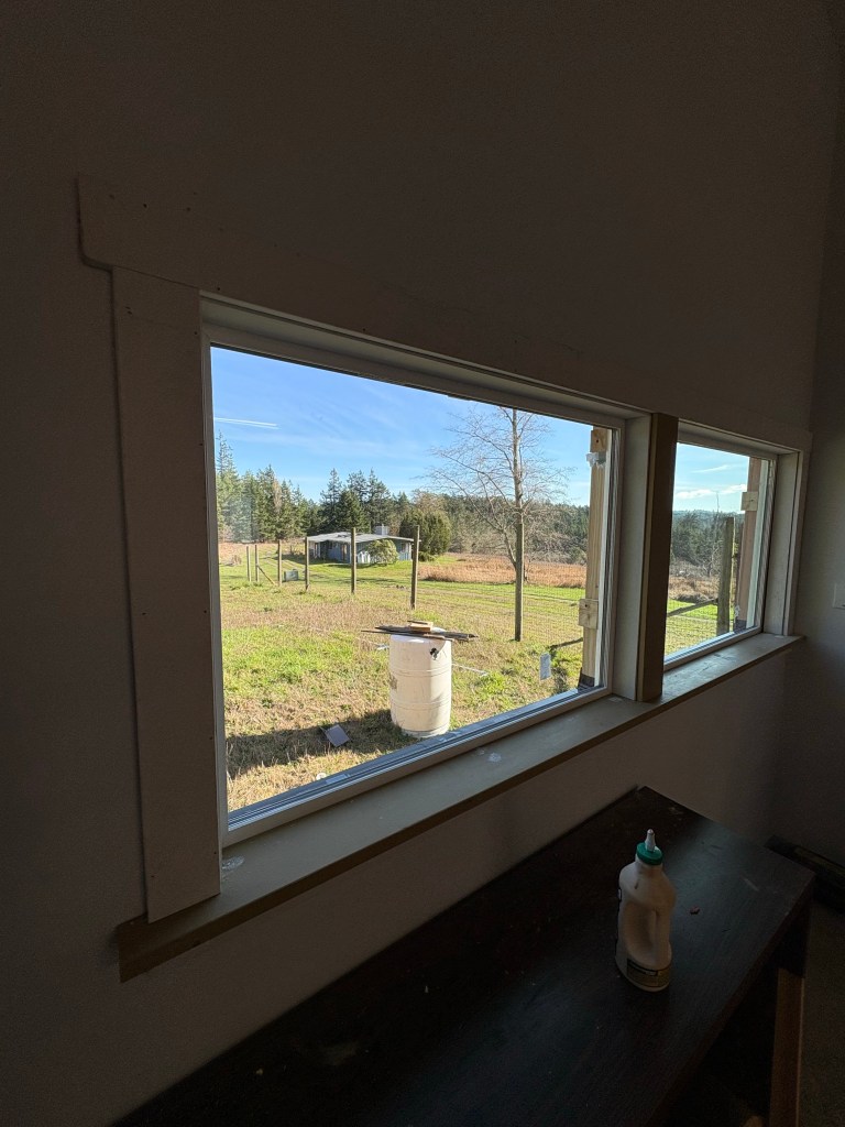 The very best part of the new windows is that you can see out of them!Paint in process.Exterior needs nail holes spackled and a final coat of paint. We used the house color, because why not? The building is looking scrappy shabby-chic. Our contractor wants to dress the other window (pump room). I’ve asked for material costs, and will say ‘go for it.’Even the reflection in the window(s) is finer than the view out of them used to be!