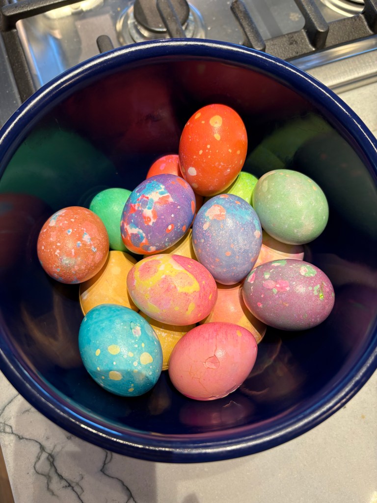 Today, on mom’s birthday, we took our grandson to brunch at my DH’s mom’s assisted living community. She was delighted to see him and marveled at how much he’d grown. We do too, everytime we see him! Upon returning home, a discovery was made… The Easter Bunny had stopped by! And then we colored Easter eggs the way mom taught me.